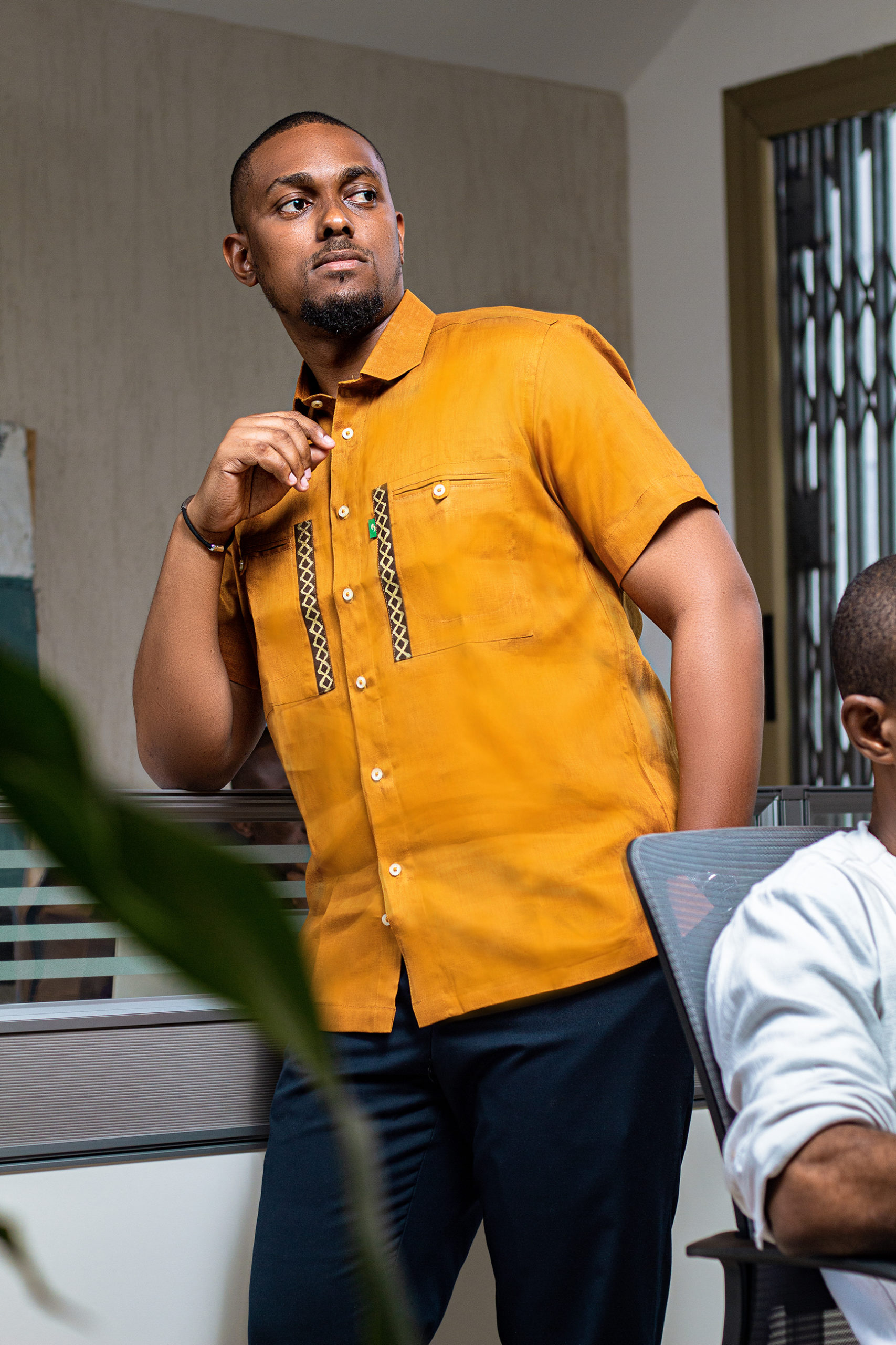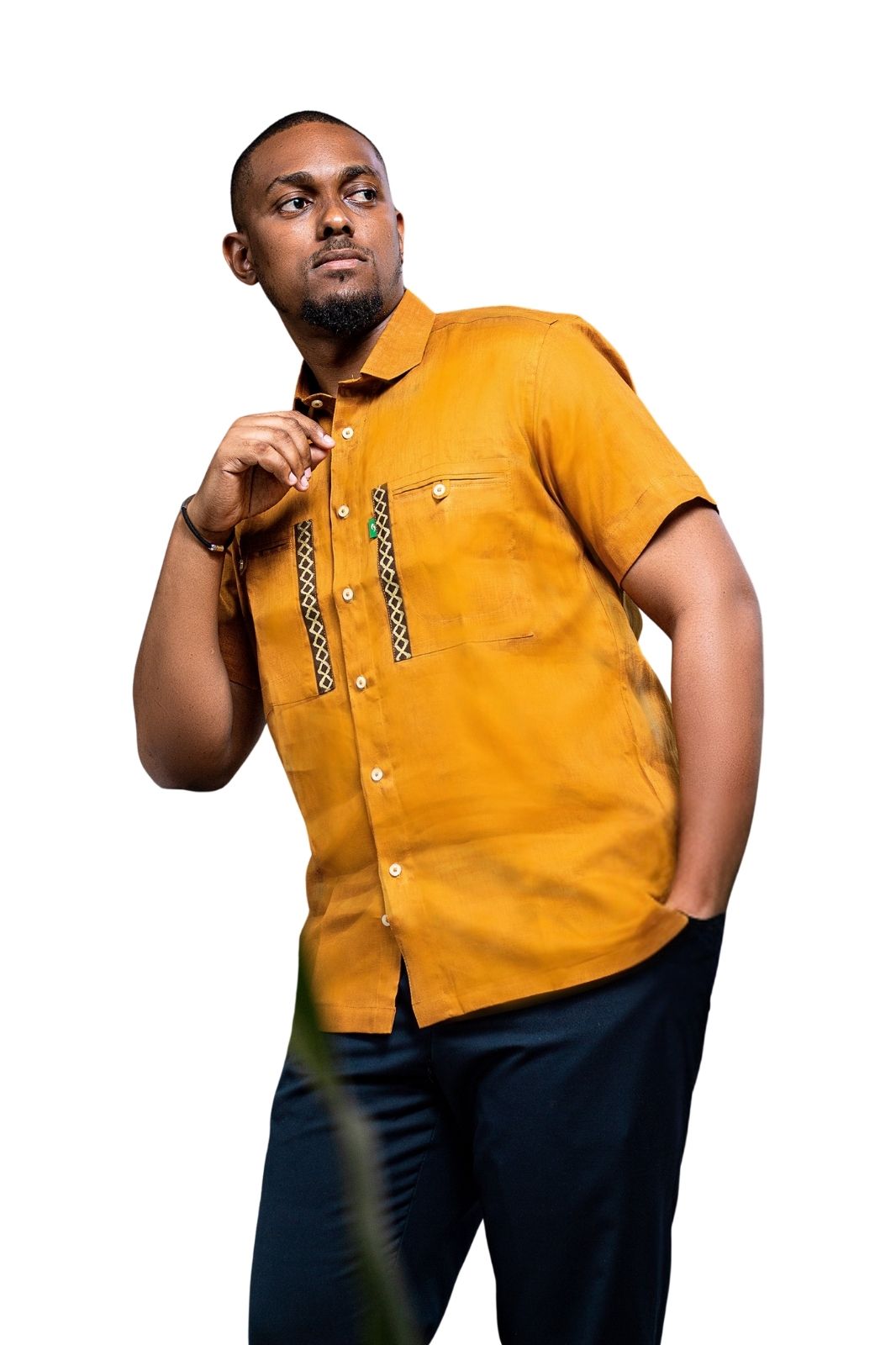 Design : Chemise à coupe droite, avec un col classique et un boutonnage central harmonieux. Le tissu d’un jaune profond confère une allure chaleureuse et distinctive. Les bandes décoratives verticales à motifs géométriques apportent une touche d’originalité et d’identité.